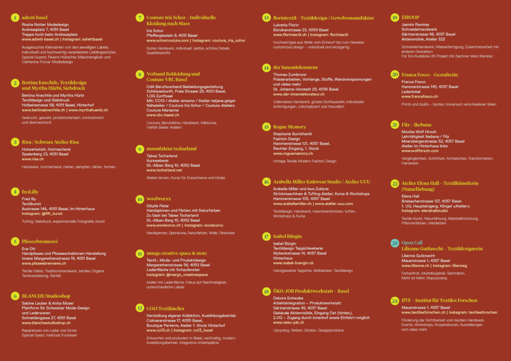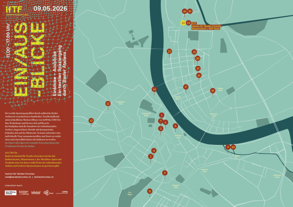 Am 09.05.2026 findet die sechste Ausgabe des textilen Spaziergang statt. Er führt durch zahlreiche Basler Ateliers in verschiedenen Stadtteilen. Textilschaffende unterschiedlicher Metiers öffnen ihre Werkräume und freuen sich auf Ihren Besuch. textilesforschen.ch/projekte
